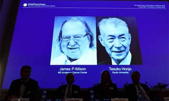 സ്റ്റോക്ക് ഹോം : വൈദ്യശാസ്ത്രത്തിലെ മികവിനുള്ള ഈ വര്ഷത്തെ നൊബേല് സമ്മാനം ജയിംസ് പി.അലിസോണ് (യുഎസ്), ടസുകു ഹോന്ജോ (ജപ്പാന്) എന്നിവര്ക്ക്. കാന്സര് ചികില്സാ ഗവേഷണത്തിന്റെ പേരിലാണ് പുരസ്കാരം.