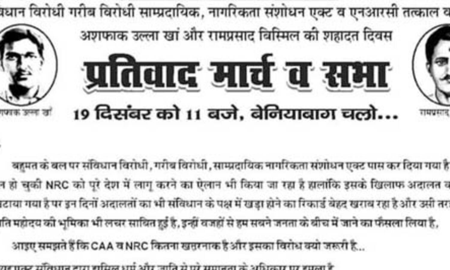 ഡിസംബര് 19 ന് നടക്കുന്ന പ്രതിഷേധ പരിപാടിയില് പങ്കെടുക്കാന് ലഘുലേഖ ആഹ്വാനം ചെയ്തിരുന്നു. ''പൗരത്വ പട്ടികയ്ക്കെതിരേയും പൗരത്വ ഭേദഗതി നിയമത്തിനെതിരേയും നടക്കുന്ന പ്രതിഷേധ പരിപാടിയില് പങ്കെടുക്കുക, പൗരത്വ നിയമം ഭരണഘടനാവിരുദ്ധവും ദരിദ്രര്ക്കെതിരുമാണ്. അഷ്ഫഖുല്ല ഖാന്റെയും രാം പ്രസാദ് ബിസ്മില്ന്റെയും രക്തസാക്ഷി ദിനത്തില് ബനിയ ബാഗില് 11 മണിക്ക് നമുക്ക് കാണാം- ലഘുലേഖയില് പറയുന്നു.