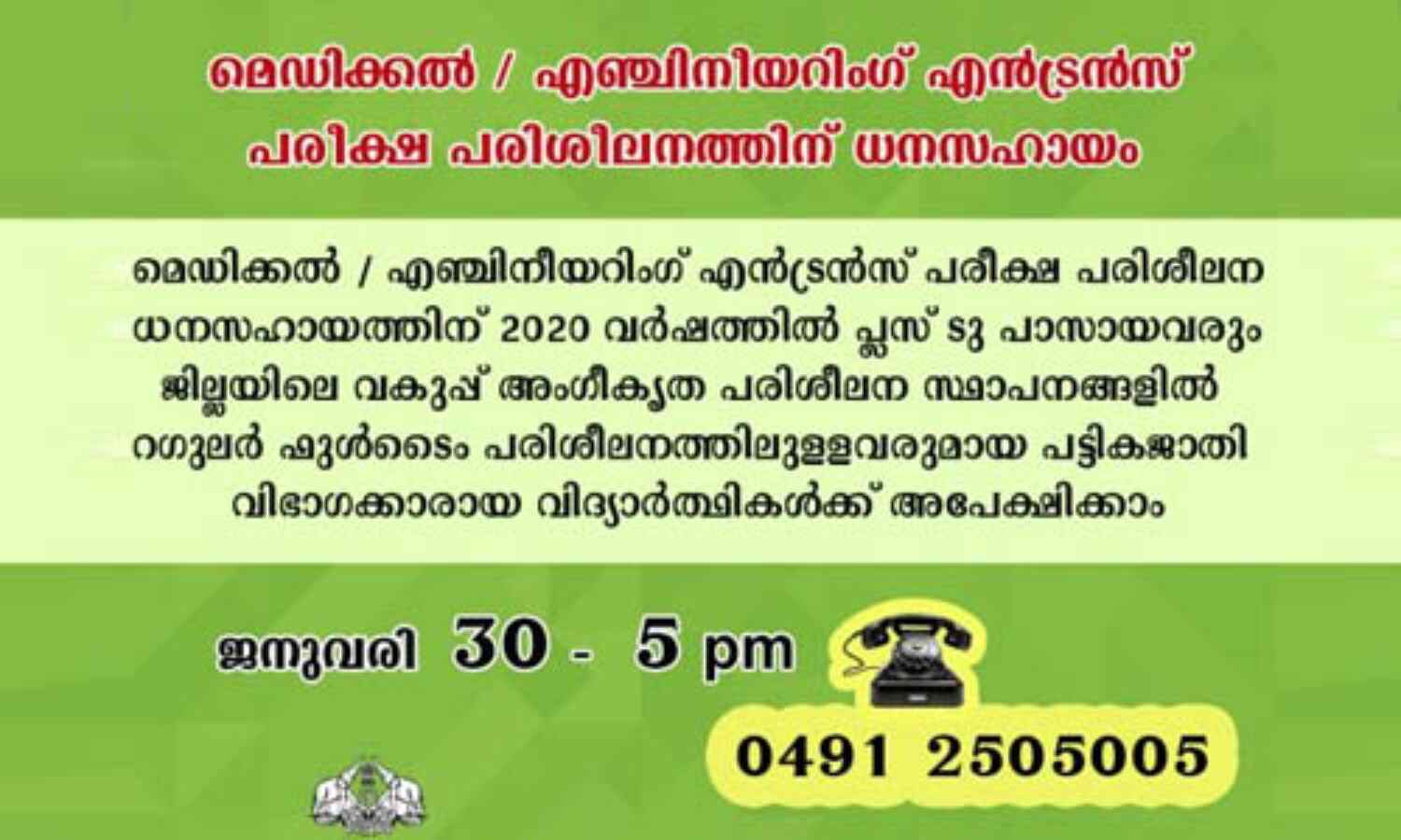 പാലക്കാട് ജില്ലയില് മെഡിക്കല്/ എഞ്ചിനീയറിംഗ് എന്ട്രന്സ് പരീക്ഷാ പരിശീലനത്തിന് ധനസഹായം