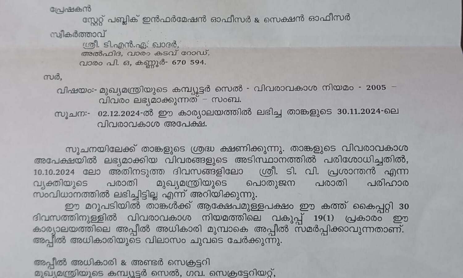 നവീന്ബാബുവിന്റെ മരണം: ടി വി പ്രശാന്തന്റെ പരാതി മുഖ്യമന്ത്രിയുടെ പരാതി പരിഹാര സെല്ലിന് ലഭിച്ചിട്ടില്ലെന്ന് മുഖ്യമന്ത്രിയുടെ ഓഫിസ്