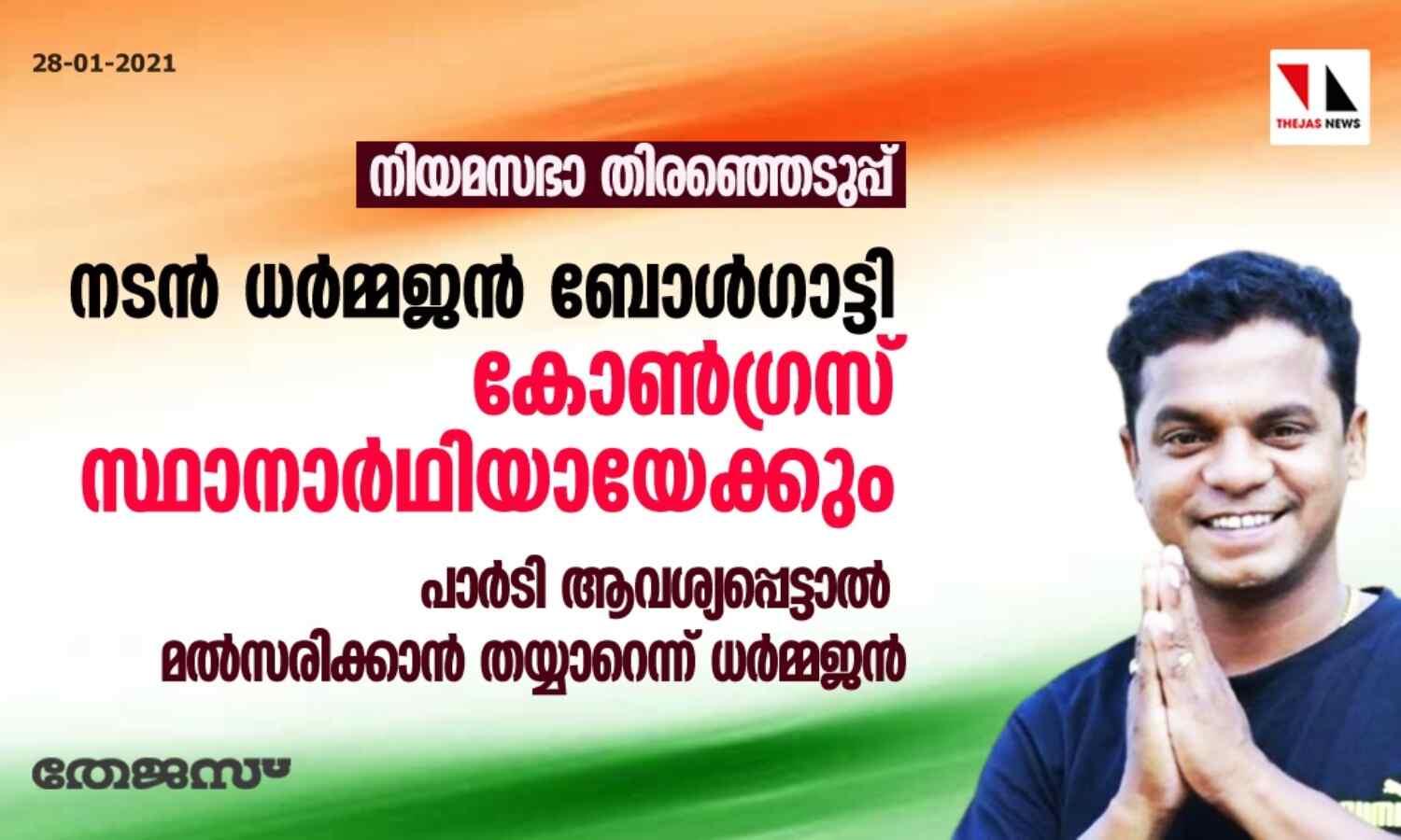 കോഴിക്കോട് ബാലുശ്ശേരി നിയോജകമണ്ഡലത്തിലാണ് ധര്മ്മജനെ കോണ്ഗ്രസ് സ്ഥാനാര്ഥിയായി പരിഗണിക്കുന്നതെന്നാണ് സൂചന.ഇത് സംബന്ധിച്ച് കോണ്ഗ്രസ് നേതൃത്വം ധര്മ്മജനുമായി പ്രാഥമിക ചര്ച്ച നടന്നുകഴിഞ്ഞുവെന്നാണ് വിവരം.പാര്ടി ആവശ്യപ്പെട്ടാല് സ്ഥാനാര്ഥിയാകാന് താന് തയ്യാറാണെന്ന് ധര്മ്മജന് പറഞ്ഞു. താന് ഒരു കോണ്ഗ്രസ് പ്രവര്ത്തകനാണ്.ജനങ്ങള്ക്ക് വേണ്ടി നല്ലകാര്യങ്ങള് ചെയ്യാന് പറ്റുന്നത് നല്ലൊരു കാര്യമായിട്ടാണ് കരുതുന്നത്