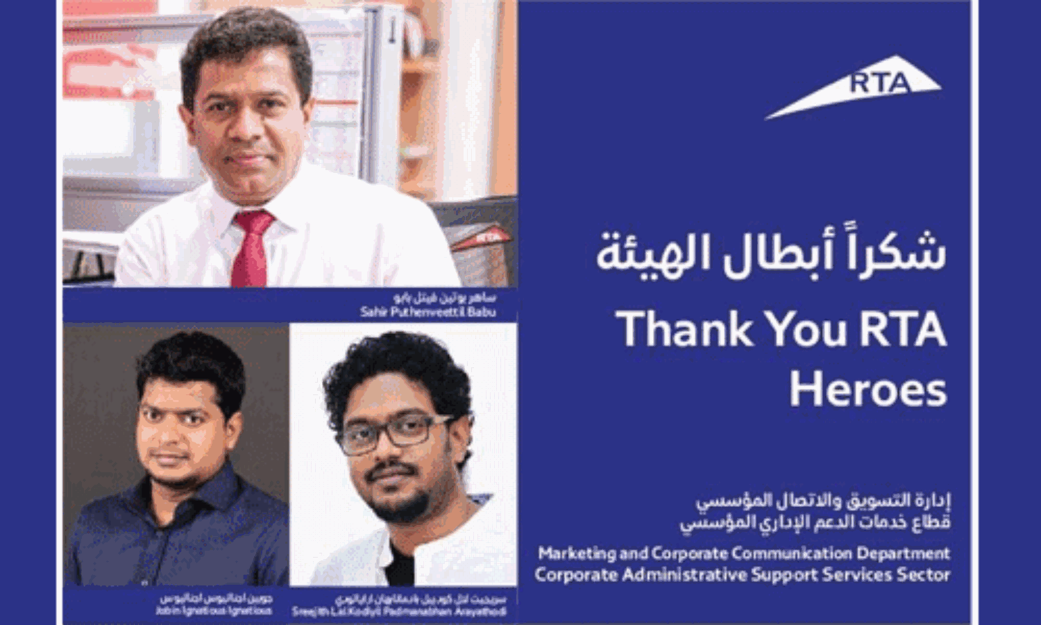 പതിനായിരത്തോളം വരുന്ന ജീവനക്കാര്ക്ക് ആര്ടിഎ അയച്ച മെയിലില് ആര്ടിഎയുടെ ഹീറോകളായാണ് മൂവരെയും വാഴ്ത്തിയിരിക്കുന്നത്.