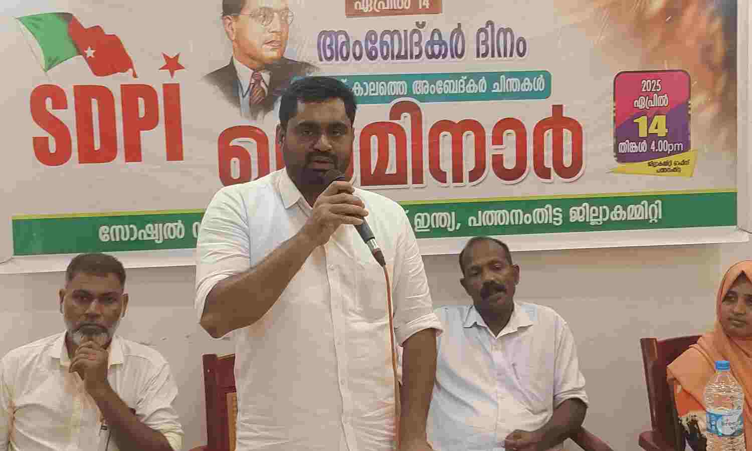 പത്തനംതിട്ട: ഏപ്രിൽ 14 അംബേദ്കർ ദിനത്തിൽ എസ്ഡിപിഐ പത്തനംതിട്ട ജില്ലാ കമ്മിറ്റിയുടെ നേതൃത്വത്തിൽ ഫാസിസ്റ്റ് കാലത്തെ അംബേദ്കർ ചിന്തകൾ എന്ന വിഷയത്തിൽ സെമിനാർ സംഘടിപ്പിച്ചു. ജില്ലാ പ്രസിഡന്റ് എസ് മുഹമ്മദ് അനീഷ് സെമിനാർ ഉദ്ഘാടനം ചെയ്തു. ജില്ലാ വൈസ് പ്രസിഡന്റ് എം ഡി ബാബു അധ്യക്ഷത വഹിച്ചു. ജില്ലാ ജനറൽ സെക്രട്ടറി ഓർഗനൈസർ അൻസാരി മുട്ടാർ, ജില്ലാ സെക്രട്ടറിമാരായ ഷെയ്ക്ക് നജീർ, ഷഫ്ന റാഷിദ്, ജില്ലാ ട്രഷറർ ഷാജി കോന്നി, ജില്ലാ സെക്രട്ടറിയേറ്റ് അംഗം സിയാദ് നിരണം, ജില്ലാ കമ്മിറ്റി അംഗങ്ങളായ ബിനു ജോർജ്, അംജിത മോൾ, ആറന്മുള മണ്ഡലം പ്രസിഡന്റ് എസ് മുഹമ്മദ് റാഷിദ് സംസാരിച്ചു.