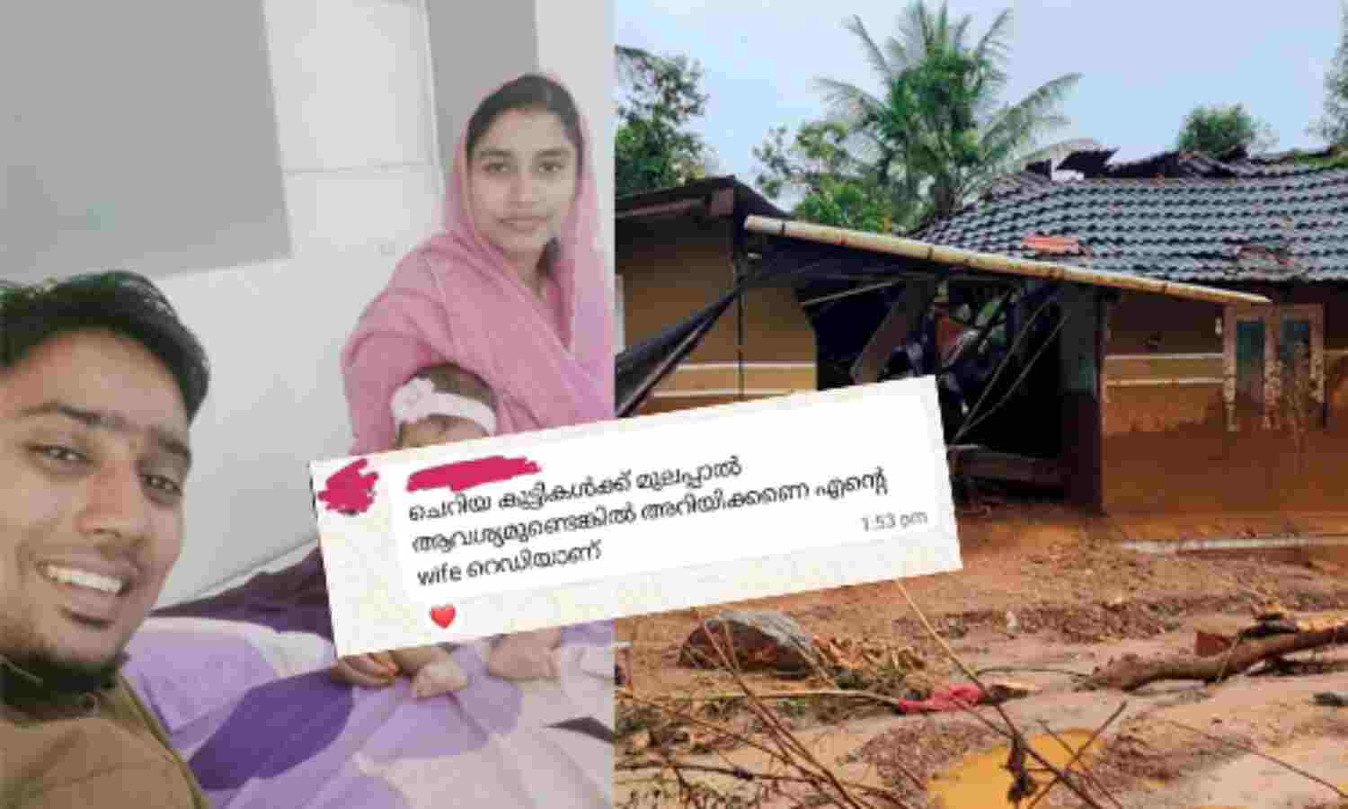 വയനാട് വെള്ളമുണ്ട സ്വദേശിയായ അസീസ് വയനാട് ജില്ലയിലെ സന്നദ്ധ സംഘടന ഗ്രൂപ്പിലാണ് സന്ദേശം പോസ്റ്റ് ചെയ്തത്. യൂത്ത് ലീഗ് മാനന്തവാടി നിയോജക മണ്ഡലം ഖജാഞ്ചിയും ജില്ലാ ലീഗല് അതോറിറ്റി ജീവനക്കാരനുമായ അസീസ് ദുരിതാശ്വാസ ക്യാംപുകളിലെത്തിയപ്പോള് നേരില്ക്കണ്ട ആഘാതം ഭാര്യയോട് പങ്കുവയ്ക്കുകയായിരുന്നു. അപ്പോഴാണ് മുലപ്പാല് ആവശ്യമെങ്കില് നല്കാന് തയ്യാറാണെന്ന്