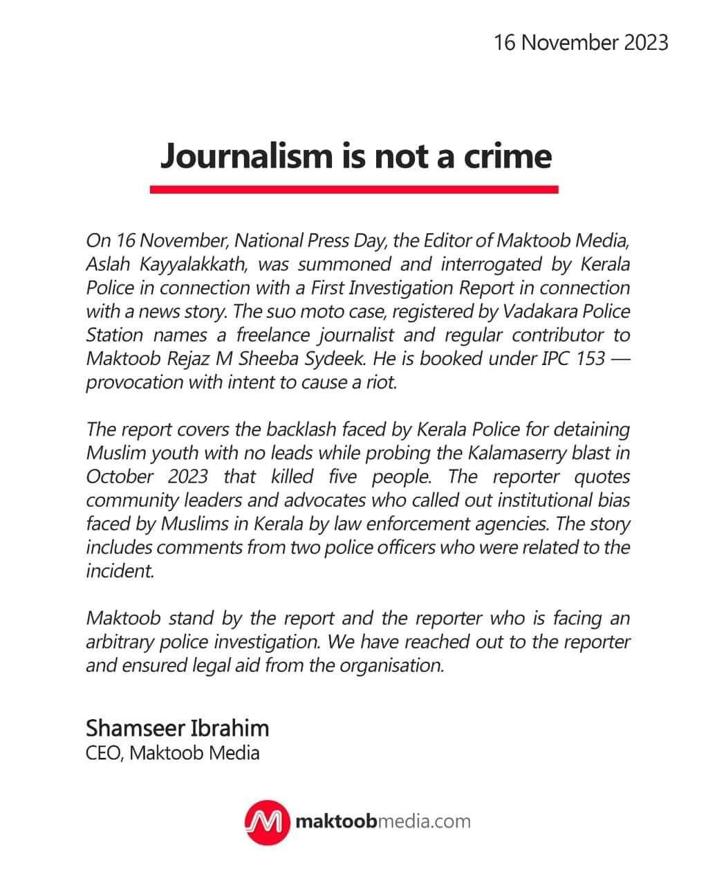 അതേസമയം, വസ്തുതകളെ അടിസ്ഥാനമാക്കിയുള്ള എന്റെ റിപോര്ട്ടില് ഉറച്ചുനില്ക്കുന്നതായും എനിക്കെതിരേ കേസെടുത്തത് യോഗി ആദിത്യനാഥോ ഏതെങ്കിലും ബിജെപി ഭരിക്കുന്ന സംസ്ഥാനമോ അല്ല, പിണറായി വിജയന്റെ നേതൃത്വത്തിലുള്ള സിപിഎം സര്ക്കാരിന്റെ നേതൃത്വത്തിലുള്ള പോലിസാണെന്നും ഇന്ന് ദേശീയ പത്രദിനം കൂടിയാണെന്നും റെജാസ് എം ഷീബാ സിദീഖ് ഫേസ്ബുക്കിലൂടെ അറിയിച്ചു. വാര്ത്തയില് ഉറച്ചുനില്ക്കുന്നതായും റിപോര്ട്ടര്ക്കെതിരായ നടപടയില് നിയപരമായ എല്ലാ പിന്തുണയും നല്കുമെന്നും മക്തൂബ് മീഡിയ സിഇഒ ശംസീര് ഇബ്രാഹീം പ്രസ്താവനയില് അറിയിച്ചു.