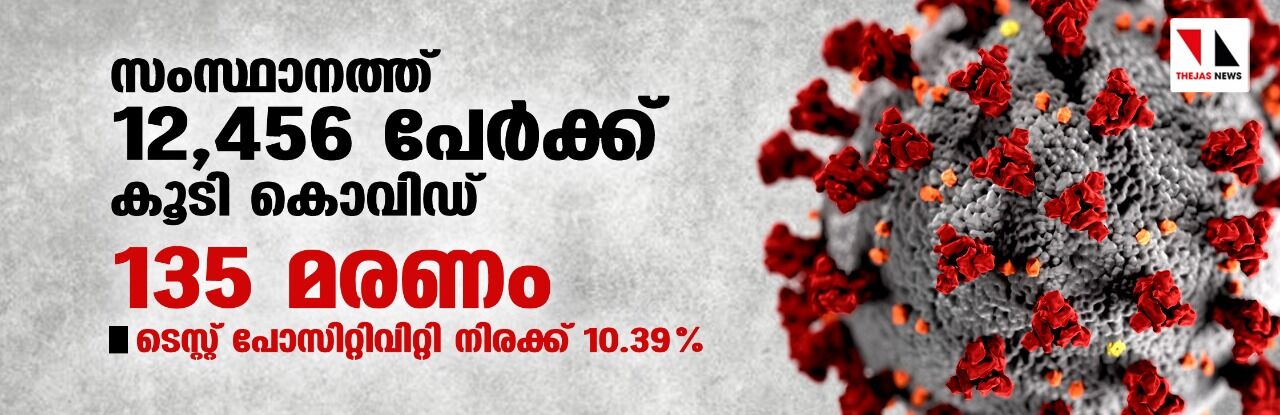 സംസ്ഥാനത്ത് ഇന്ന് 12,456 പേര്ക്ക് കൊവിഡ്; 135 മരണം, ടെസ്റ്റ് പോസിറ്റിവിറ്റി നിരക്ക് 10.39 ശതമാനം