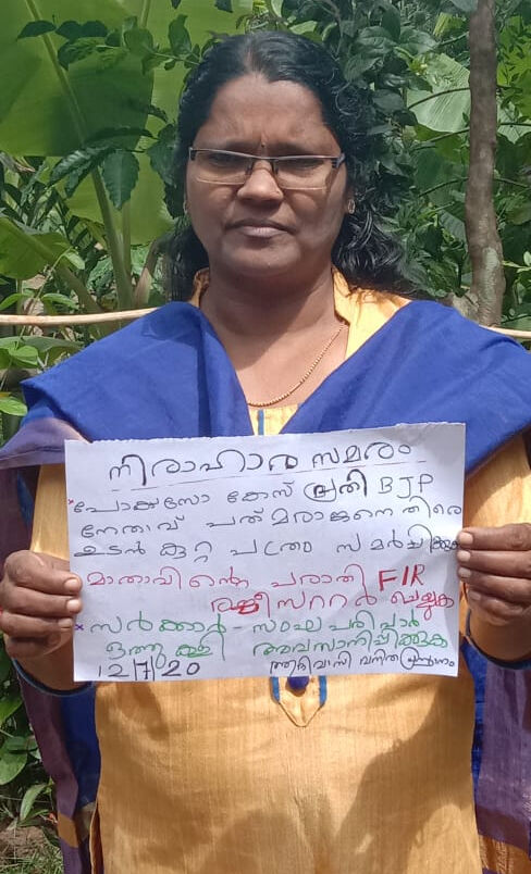 പാലത്തായി പോക്സോ പീഡനക്കേസില് ബുധനാഴ്ചക്കകം കുറ്റപത്രം നല്കണമെന്നും പൊയിലൂര് പീഡനത്തില് കേസ് രജിസ്റ്റര് ചെയ്യണമെന്നുമാവശ്യപ്പെട്ട് രമ്യാ ഹരിദാസ് എംപിയടക്കമുള്ള വനിതാ പ്രമുഖരാണ് ഇന്ന് നിരാഹാര സമരം നടത്തുന്നത്. ലതികാ സുഭാഷ്(സംസ്ഥാന പ്രസിഡന്റ് മഹിളാ കോണ്ഗ്രസ്), സികെ ജാനു, ശ്രീജ നെയ്യാറ്റിന്കര, അംബിക(എഡിറ്റര് മറുവാക്ക്), അമ്മിണി കെ വയനാട് (സംസ്ഥാന പ്രസിഡന്റ് ആദിവാസി വനിതാ പ്രസ്ഥാനം), അഡ്വ. ഫാത്തിമ തഹ്ലിയ(എംഎസ്എഫ് ദേശീയ വൈസ് പ്രസിഡന്റ്), കെ കെ റൈഹാനത്ത്(സംസ്ഥാന പ്രസിഡന്റ് വിമണ് ഇന്ത്യ മൂവ്മെന്റ്), ജോളി ചിറയത്ത്(അഭിനേത്രി, ആക്ടിവിസ്റ്റ്), പ്രമീളാ ഗോവിന്ദ്(മാധ്യമ പ്രവര്ത്തക), ലാലി പി എം(സിനിമാ പ്രവര്ത്തക) തുടങ്ങിയവരാണ് അവരവരുടെ ഇടങ്ങളില് രാവിലെ ആറുമുതല് നിരാഹാര സമരമാരംഭിച്ചത്. പെമ്പിളൈ ഒരുമൈ സമര നായിക ഗോമതി ഇടുക്കി, മഹിളാ കോണ്ഗ്രസ് സംസ്ഥാന സെക്രട്ടറി സോയാ ജോസഫ്, ആക്ടിവിസ്റ്റുകളായയ ബിന്ദു അമ്മിണി, അഡ്വ. കുക്കു ദേവകി, ദിയ സന, ബിന്ദു തങ്കം കല്യാണി തുടങ്ങി നിരവധി പ്രമുഖരും ഐക്യ ദാര്ഢ്യം പ്രഖ്യാപിച്ചിട്ടുണ്ട്. വൈകിട്ട് ആറു വരെയാണ് നിരാഹാര സമരം.