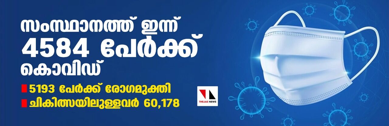 സംസ്ഥാനത്ത് ഇന്ന് 4584 പേര്ക്ക് കൊവിഡ്, 5193 പേര് രോഗമുക്തി നേടി; ചികിത്സയിലുള്ളവര് 60,178; ഇതുവരെ രോഗമുക്തി നേടിയവര് 9,56,935,