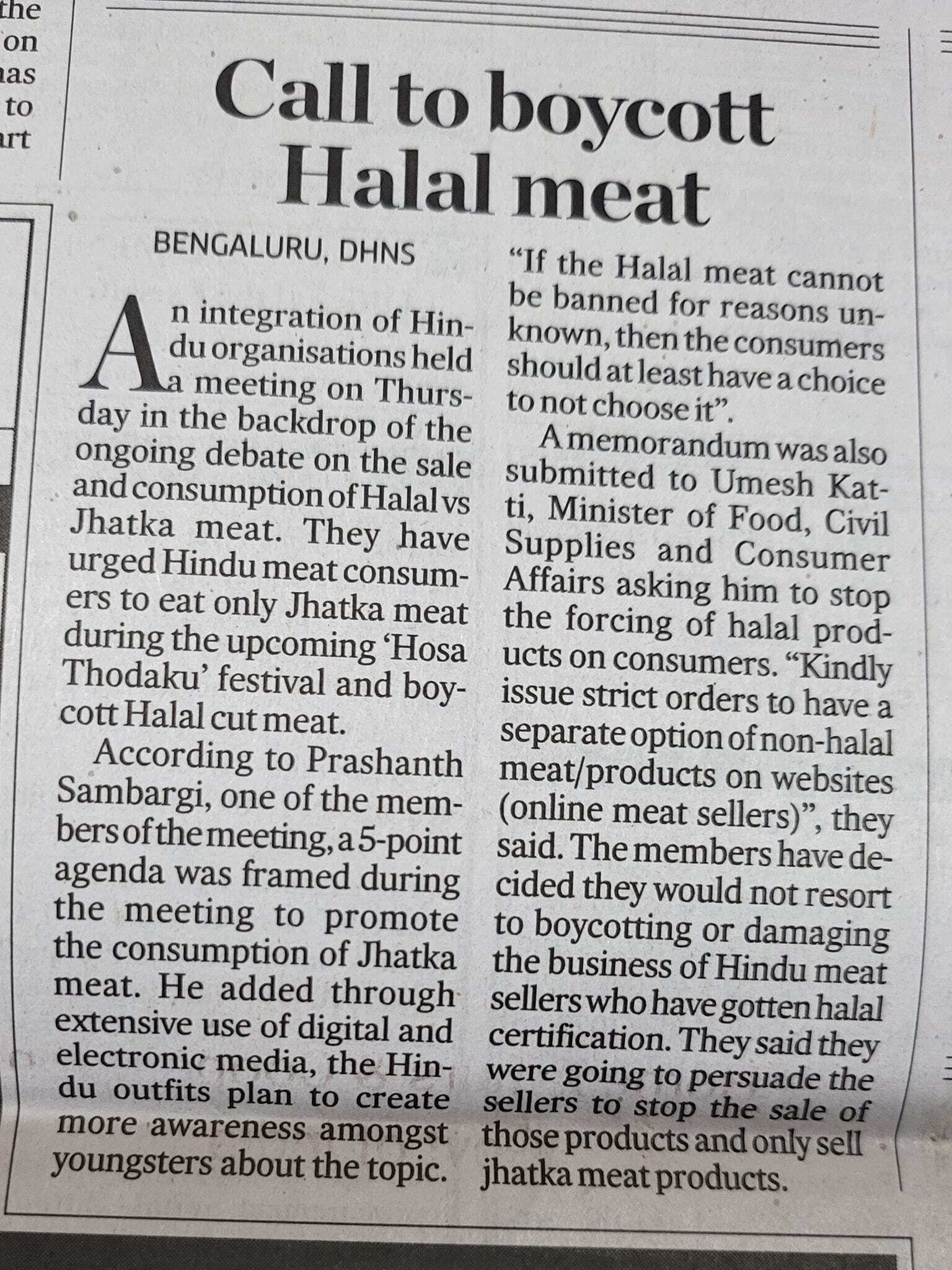 ഹിജാബ് വിവാദം, ക്ഷേത്രപരിസരങ്ങളിലോ ഉല്സവങ്ങളിലോ സ്റ്റാളുകള് സ്ഥാപിക്കുന്നതില് നിന്ന് മുസ്ലിം വ്യാപാരികള്ക്കുള്ള നിരോധനം തുടങ്ങിയവയുടെ പശ്ചാത്തലത്തിലാണ് ഈ ഏറ്റവും പുതിയ ഹിന്ദു വലതുപക്ഷ പ്രചാരണം. ഷിമോഗയിലും ബംഗളൂരുവിലും ഉള്ളതുപോലെ, സംസ്ഥാനത്തിന്റെ മറ്റ് ഭാഗങ്ങളിലും ഹിന്ദുത്വ പ്രവര്ത്തകര് വീടുവീടാന്തരം കയറി ലഘുലേഖകള് വിതരണം ചെയ്യുകയും 'ഹിന്ദു കടകളില്' നിന്ന് മാത്രം പലചരക്ക് സാധനങ്ങളും മാംസവും വാങ്ങാന് ആളുകളെ പ്രേരിപ്പിക്കുകയും ചെയ്യുന്നുണ്ട്. എന്നാല് ഈ കച്ചവട വിലക്കിനെതിരേ നിരവധി ക്ഷേത്ര കമ്മിറ്റികള് തന്നെ രംഗത്തെത്തിയെന്നത് ആശാവഹമാണ്.