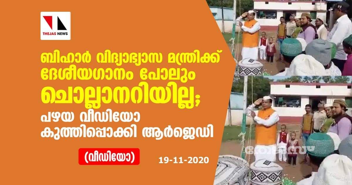 ബിഹാര് വിദ്യാഭ്യാസ മന്ത്രിയ്ക്ക് ദേശീയഗാനം പോലും ചൊല്ലാനറിയില്ല; പഴയ വീഡിയോ കുത്തിപ്പൊക്കി ആര്ജെഡി