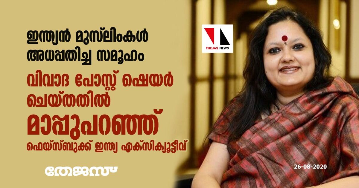 ഇന്ത്യന് മുസ്ലിംകള് അധപ്പതിച്ച സമൂഹം; വിവാദ പോസ്റ്റ് ഷെയര് ചെയ്തതില് മാപ്പുപറഞ്ഞ് ഫെയ്സ്ബുക്ക് ഇന്ത്യ എക്സിക്യൂട്ടീവ്