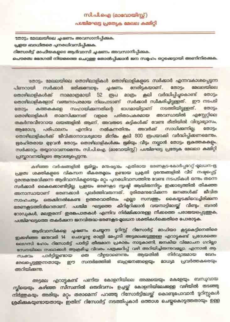 റിസോർട്ട് ആക്രമിച്ചത് പാർട്ടിക്ക് സംഭവിച്ച വീഴ്ചയാണെന്ന വിശദീകരണവുമായി മാവോവാദികൾ