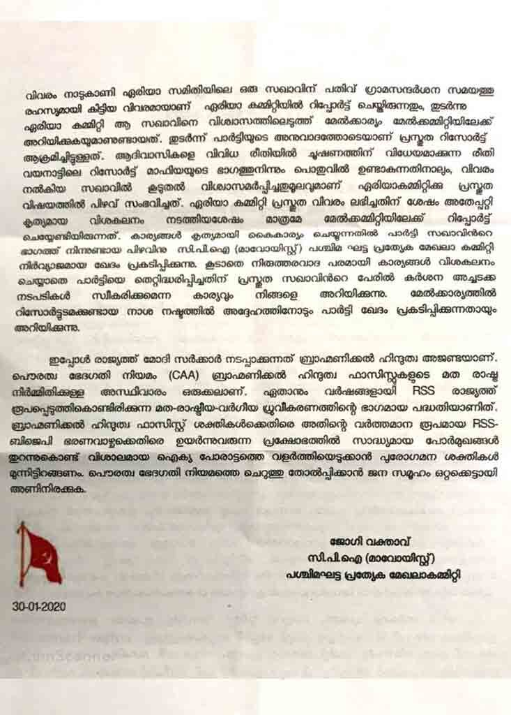 പണിയ കോളനിയിലെ അമ്മയെയും മകളെയും ബന്ധുവായ സ്ത്രീയെയും ടൂറിസ്റ്റുകൾ വഴിയിൽ തടഞ്ഞ് റിസോർട്ടിലേക്ക് കൊണ്ടുപോകാൻ ശ്രമിച്ചതായും അതിന് റിസോർട്ട് നടത്തിപ്പുകാർ ഒത്താശ ചെയ്തതായും നാടുകാണി ഏരിയ സമിതിയിലെ സഖാവാണ് ഏരിയ കമ്മിറ്റിയിൽ റിപോർട്ട് ചെയ്തത്. തുടർന്ന് പാർട്ടി അനുവാദത്തോടെയാണ് ആക്രമണം നടത്തിയത്. എന്നാൽ കാര്യങ്ങൾ കൃത്യമായി കൈകാര്യം ചെയ്യുന്നതിൽ പാർട്ടി സഖാവിന് പിഴവ് സംഭവിച്ചു. പാർട്ടിയെ തെറ്റിദ്ധരിപ്പിച്ചതിന് സഖാവിനെതിരെ കർശന അച്ചടക്കനടപടി സ്വീകരിക്കുമെന്നും കുറിപ്പിൽ പറയുന്നു.