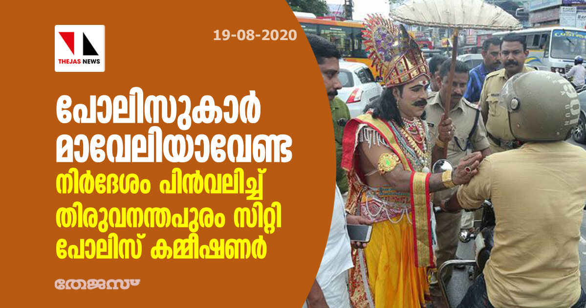 എന്നാൽ ഇതിനെതിരേ പോലിസിൽ തന്നെ വിമർശനം ഉയർന്ന സാഹചര്യത്തിലാണ് കമ്മീഷണറുടെ പുതിയ നിര്ദേശം. പോലിസുകാര് മാവേലി വേഷം കെട്ടേണ്ടെന്നും വേഷം കെട്ടാൻ ആളില്ലെങ്കിൽ പരിപാടി നടത്തേണ്ടെന്നുമാണ് ഉത്തരവ്. പ്രധാന ജങ്ഷനുകളില് മാവേലിയുടെ വേഷം കെട്ടി നിന്ന് കൊവിഡ് ബോധവല്ക്കരണം നടത്തണമെന്നാണ് കഴിഞ്ഞ ദിവസം കമ്മീഷണര് നിര്ദേശം നല്കിയിരുന്നത്.