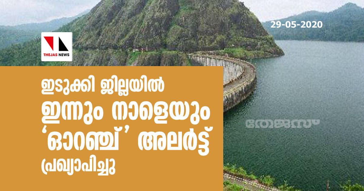 തിരുവനന്തപുരം: ഇടുക്കി ജില്ലയിൽ കേന്ദ്ര കാലാവസ്ഥ നിരീക്ഷണ വകുപ്പ് ഇന്നും നാളെയും 'ഓറഞ്ച്' അലർട്ട് പ്രഖ്യാപിച്ചു. മഴക്കാലം എത്തിയ ശേഷം ആദ്യമായാണ് ഓറഞ്ച് അലർട്ട് പ്രഖ്യാപിക്കുന്നത്. ഒറ്റപ്പെട്ടയിടങ്ങളിൽ ശക്തമായതോ (115 mm വരെ മഴ) അതിശക്തമായതോ (115 mm മുതൽ 204.5 mm വരെ മഴ) ആയ മഴയ്ക്കാണ് സാധ്യത. സർക്കാർ സംവിധാനങ്ങളും പൊതുജനങ്ങളും ജാഗ്രത പാലിക്കണം.