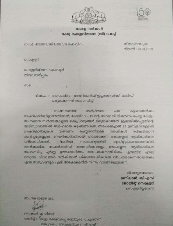 അർഹരായ കുടുംബങ്ങൾക്ക് അപേക്ഷിച്ചാൽ 24 മണിക്കൂറിനുളളിൽ റേഷൻ കാർഡ് വിതരണം ചെയ്യുന്നതിന് നടപടികൾ സ്വീകരിക്കും. റേഷൻ കാർഡിനായി ഹാജരാക്കുന്ന രേഖകളുടെ അധികാരികത പരിശോധിക്കാൻ നിലവിലുള്ള സാഹചര്യത്തിൽ ബുദ്ധിമുട്ടാണെങ്കിൽ താൽക്കാലിക റേഷൻ കാർഡ് അനുവദിക്കണം. രേഖകളുടെ ആധികാരികത സംബന്ധിച്ച പൂർണ ഉത്തരവാദിത്വം അപേക്ഷകനായിരിക്കും. തെറ്റായ വിവരങ്ങൾ നൽകിയാൽ ശിക്ഷാ നടപടികൾക്ക് വിധേയമാവുമെന്ന സത്യവാങ്മൂലം അപേക്ഷകരിൽ നിന്ന് വാങ്ങണമെന്നും ഉത്തരവിൽ പറയുന്നു.