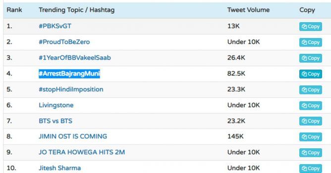 #ArrestBajrangMuni എന്ന ഹാഷ് ടാഗ് ട്വിറ്ററില് ട്രന്റിങായി മാറിയിരിക്കുകയാണ്. ട്വിറ്റര് ഇന്ത്യയുടെ കണക്ക് പ്രകാരം ഇന്ന് ഇതുവരെ നാലാം സ്ഥാനത്താണ് #ArrestBajrangMuni എന്ന ഹാഷ് ടാഗ് ട്രന്റിങിലുള്ളത്.