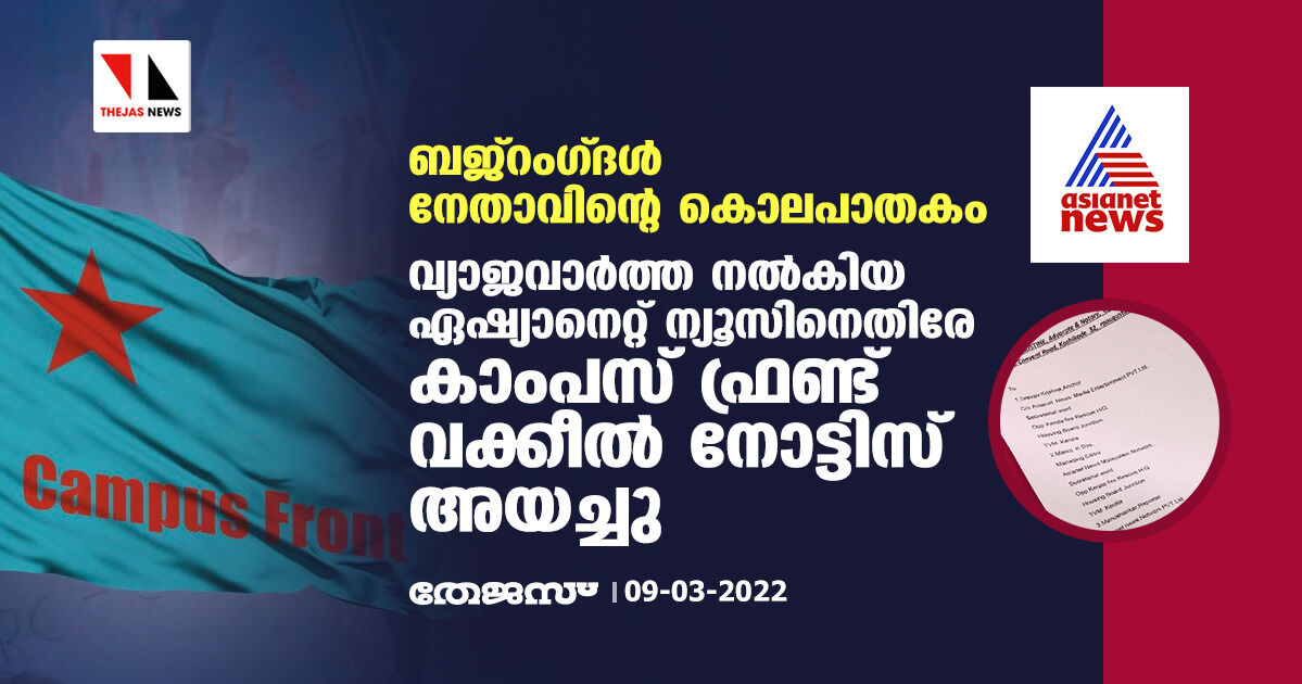 ബജ്റംഗ്ദള് നേതാവിന്റെ കൊലപാതകം: വ്യാജവാര്ത്ത നല്കിയ ഏഷ്യാനെറ്റ് ന്യൂസിനെതിരേ കാംപസ് ഫ്രണ്ട് വക്കീല് നോട്ടിസ് അയച്ചു