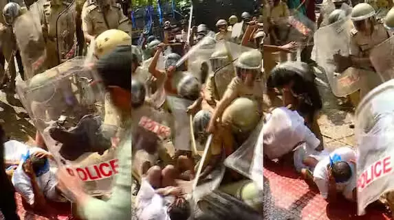 മാത്യൂ കുഴല്നാടന് എംഎല്എയുടെ ഉദ്ഘാടന പ്രസംഗത്തിന് ശേഷം പോലിസ് ബാരിക്കേഡ് കെഎസ്യു പ്രവര്ത്തകര് തകര്ക്കാന് ശ്രമിച്ചതോടെയാണ് ജലപീരങ്കി പ്രയോഗിച്ചത്. എന്നിട്ടും പ്രവര്ത്തകര് പിരിഞ്ഞുപോവാന് തയ്യാറായില്ല. ശക്തമായ ജലപീരങ്കി പ്രയോഗത്തില് വനിതാ പ്രവര്ത്തകര് അടക്കം നിലത്തുവീണതിനു പിന്നാലെയാണ് ലാത്തിവീശിയത്. പോലിസില് സംഘപരിവാരവല്ക്കരണം നടക്കുകയാണെന്നും മുഖ്യമന്ത്രി മറുപടി പറയണമെന്നും കെഎസ്യു സംസ്ഥാന പ്രസിഡന്റ് അലോഷ്യസ് സേവ്യര് പറഞ്ഞു. അലോഷ്യസ് സേവ്യറിനെ റോഡിലേക്ക് വലിച്ചിട്ട് മര്ദ്ദിക്കുകയും ചെയ്തു. പ്രവര്ത്തകരെ അറസ്റ്റ് ചെയ്തു നീക്കിയെങ്കിലും ബലംപ്രയോഗിച്ച് അവരെ പുറത്തിറക്കി. ലാത്തിച്ചാര്ജില് മാത്യു കുഴല്നാടന് എംഎല്എ ഉള്പ്പെടെയുള്ളവര്ക്ക് പരിക്കേറ്റു. മാര്ച്ച് തുടങ്ങിയ ഉടനെ ജലപീരങ്കി പ്രയോഗിച്ചശേഷം ലാത്തിചാര്ജ് നടത്തിയെന്നാണ് കെഎസ്യു ആരോപണം.