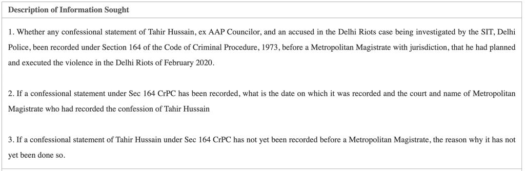 ഡല്ഹി കലാപം ആസൂത്രണം ചെയ്യുകയും നടപ്പാക്കുകയും ചെയ്തതായി ഹുസൈന് എന്തെങ്കിലും കുറ്റസമ്മതം നടത്തിയോ എന്നും ഉണ്ടെങ്കില് ഏത് മജിസ്ട്രേറ്റിന്റെ മുമ്പില് എപ്പോള് നടത്തിയെന്നുമാണ് ദത്ത വിവരാവകാശ നിയമപ്രകാരം ആരാഞ്ഞത്. ദി പ്രിന്റ്, എന്ഡിടിവി, സീ ന്യൂസ്, ന്യൂസ് ഏജന്സിയായ ഏഷ്യന് ന്യൂസ് ഇന്റര്നാഷണല് (എഎന്ഐ)എന്നിവ താഹിര് ഹുസൈന്റെ കുറ്റസമ്മത വാര്ത്ത പ്രസിദ്ധീകരിച്ചിരുന്നു. രേഖകള് പരിശോധിച്ചാണ് തങ്ങള് ഈ വാര്ത്ത പ്രസിദ്ധീകരിക്കുന്നതെന്ന് എഎന്ഐയും പ്രിന്റും അവകാശപ്പെട്ടപ്പോള് ഡല്ഹി പോലിസിനെ ഉദ്ധരിച്ചായിരുന്നു സീ ന്യൂസ് ഈ 'കുറ്റസമ്മത മൊഴി' പ്രസിദ്ധീകരിച്ചത്.