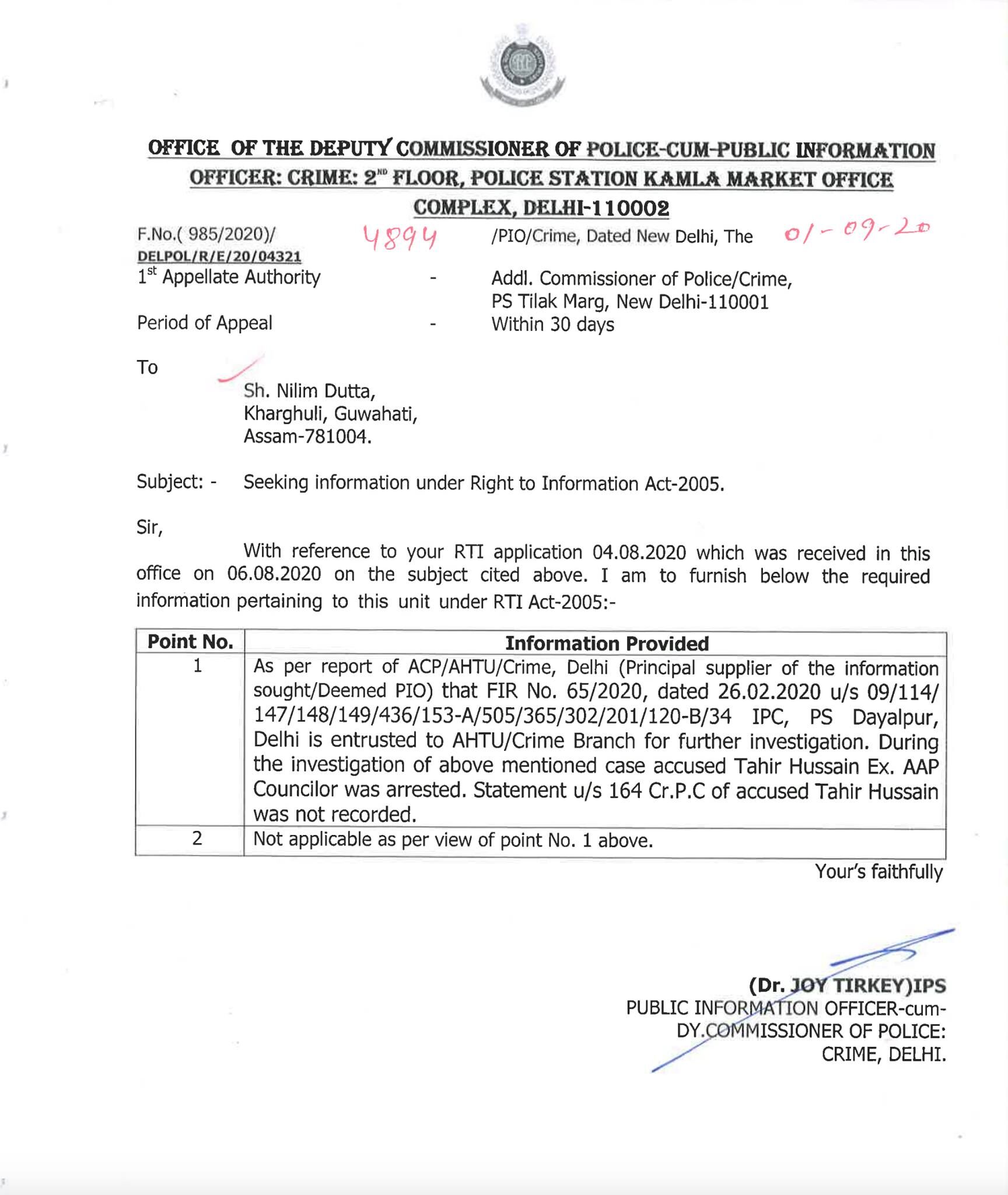 യുനിഫൈഡ് പീപ്പിള്സ് മൂവ്മെന്റ് ചെയര്മാനും ആക്റ്റീവിസ്റ്റുമായ നിലീം ദത്ത വിവരാവകാശ നിയമപ്രകാരം സമര്പ്പിച്ച ചോദ്യത്തിന് 'സിആര്പിസി സെക്ഷന് 164' പ്രകാരം താഹിര് ഹുസൈന്റെ ഒരു കുറ്റസമ്മതവും രേഖപ്പെടുത്തിയിട്ടില്ലെന്നാണ് ഡല്ഹി ക്രൈംബ്രാഞ്ച് പോലിസ് മറുപടിയായി നല്കിയിട്ടുള്ളത്.