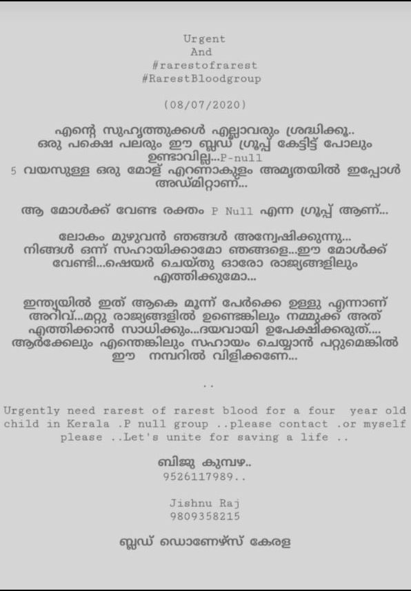 അനുഷ്കയുടെ ജീവന് രക്ഷിക്കാന് പി-നള് ഗ്രൂപ്പ് രക്തം വേണം; ലോകം മുഴുവന് സന്ദേശം അയച്ച് രക്ത ദാതാക്കളുടെ കൂട്ടായ്മ