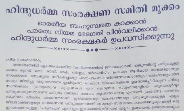പൗരത്വ നിയമ ഭേദഗതിക്കെതിരേ ഹിന്ദു ധര്മ സംരക്ഷണ സമിതി ഉപവാസം നടത്തുന്നു