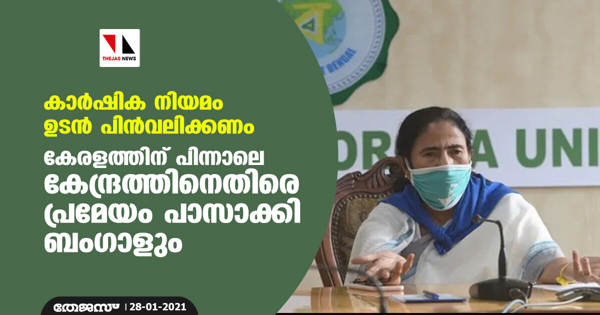 കര്ഷക വിരുദ്ധമായ നിയമം ഉടന് പിന്വലിക്കാന് കേന്ദ്ര സര്ക്കാര് തയ്യാറാവണമെന്ന് പാര്മെന്ററി കാര്യവകുപ്പ് മന്ത്രി പാര്ത്ത ചാറ്റര്ജി അവതരിപ്പിച്ച പ്രമേയത്തിലൂടെ ബംഗാള് സര്ക്കാര് ആവശ്യപ്പെട്ടു.