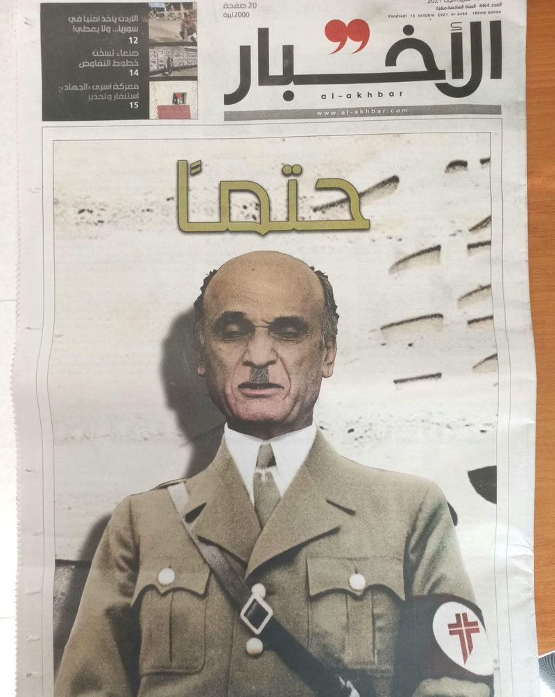 എല്എഫ് നേതാവ് സമീര് ഗിയാഗിയയെ അഡോള്ഫ് ഹിറ്റ്ലറുമായി ഉപമിച്ച് ഹിസ്ബുള്ള അനുകൂല പത്രം 'അല് അഖ്ബര്' ഫോട്ടോ പ്രസിദ്ധീകരിച്ചിട്ടുണ്ട്. സൈനിക യൂനിഫോം ധരിച്ച് ഹിറ്റലറുടെ മീശയുമായുള്ള സമീറിന്റെ പടമാണ് 'സംശയമില്ല (അയാള് കൊലപാതകത്തിന് ഉത്തരവിട്ടു)' എന്ന വാക്കുകള്ക്കൊപ്പം പ്രസിദ്ധീകരിച്ചിട്ടുള്ളത്.