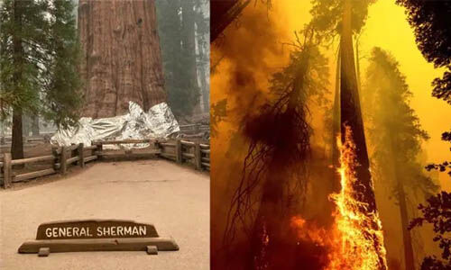 കാലഫോര്ണിയയില് കാട്ടുതീ പടര്ന്നുപിടിച്ചന്നതിനെ തുടര്ന്ന് ലോകത്തിലെ ഏറ്റവും വലിയ മരമായ ജനറല് ഷെര്മനെ സംരക്ഷിക്കാന് അടിഭാഗം തീയെ പ്രതിരോധിക്കാന് ശേഷിയുള്ള അലുമിനിയം ഫോയില് പേപ്പര് ഉപയോഗിച്ചാണ് അഗ്നിശമന സേനാംഗങ്ങള് പൊതിഞ്ഞത്. ഇത് വലിയ രീതിയില് മരത്തെ കാട്ടുതീയില്നിന്ന് രക്ഷിച്ചതായി കാണപ്പെട്ടു. എന്നാല്, ഇപ്പോഴുണ്ടായ കാട്ടുതീയില് ഇത്തരത്തിലുള്ള മരങ്ങള്ക്കും നാശനഷ്ടമുണ്ടാവുകയായിരുന്നു.