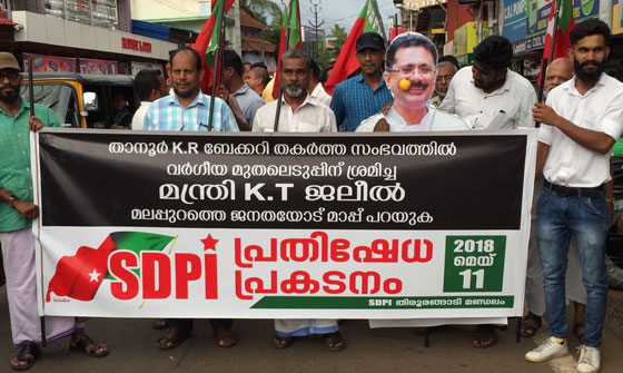 തിരൂരങ്ങാടി: സോഷ്യല് മീഡിയ ഹര്ത്താലിന്റെ മറവില് താനൂര് ബേക്കറി അക്രമിച്ച സംഭവം വര്ഗീയ ചേരിതിരിവ് സൃഷ്ടിക്കാന് ശ്രമിക്കുകയും, അതിന്റെ പേരില് പണം പിരിവ് നടത്തുകയും ചെയ്ത മന്ത്രി കെ ടി ജലീല് മാപ്പ് പറഞ്ഞ് രാജിവെക്കണമെന്ന് ആവശ്യപ്പെട്ട് എസ്.ഡി.പി ഐ തിരൂരങ്ങാടി മണ്ഡലം കമ്മറ്റിയുടെ നേതൃത്വത്തില് ചെമ്മാട് പ്രതിഷേധ പ്രകടനവും, മന്ത്രിയുടെ കോലവും കത്തിച്ചു. ബേക്കറി കേസില് പിടിക്കപെട്ട 9 പേരില് 7 പേരും സി.പിഎം ക്രിമിനല് സംഘമാണന്നിരിക്കെ സംഭവത്തില് മുസ്ലീംങ്ങളെ കരിവാരിതേച്ച മന്ത്രി പിരിച്ചെടുത്ത പണം തിരിച്ച് നല്കുകയും, നഷ്ടം സി.പി.എം ഫണ്ടില് നിന്ന് നല്കാന് ആര്ജവം കാണിക്കണമെന്നും പ്രതിഷേധക്കാര് ആവശ്യപ്പെട്ടു പ്രകടനത്തിന് മണ്ഡലം പ്രസി.ഹമീദ് പരപ്പനങ്ങാടി, സിക്രട്ടറി.ഉസ്മാന് ഹാജി, ജാഫര് ചെമ്മാട്, മൊയ്തീന് കുണ്ടൂര്, ജലീല് നേതൃത്വം നല്കി