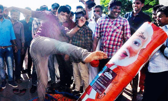 സമരം തുടങ്ങിയതോടെ വഴിയില് പോകുന്നവരെല്ലാം മോദിയെ ചവിട്ടിയും തൊഴിച്ചും അരിശം തീര്ത്തു. പ്രതിഷേധത്തിന് വ്യത്യസ്ഥ മാര്ഗങ്ങള് തിരഞ്ഞെടുക്കാനുള്ള അവസരവും സമരക്കാര്ക്ക് ഒരുക്കിയിട്ടുണ്ട്.