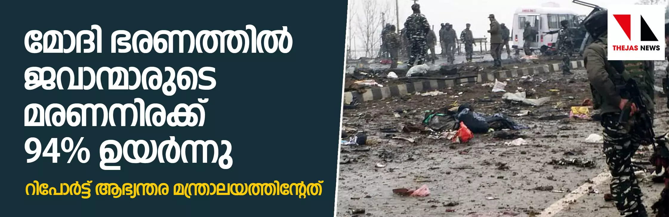 ഫെബ്രുവരി 5ന് കേന്ദ്ര ആഭ്യന്തര സഹമന്ത്രി ഹന്സ്രാജ് ഗംഗാറാം അഹിര് ലോക്സഭയില് നല്കിയ മറുപടിയിലാണ് ഇക്കാര്യം വ്യക്തമാക്കുന്നത്. 2014ല് 47ശതമാനവും 2018ല് 91ശതമാനവുമാണ് മരണനിരക്ക്. പുല്വാമ ആക്രമണത്തിലൂടെ ജവാന്മാരുടെ മരണനിരക്ക് 94ശതമാനത്തിലെത്തി. 2010ല് 75 സിആര്പിഎഫ് ജവാന്മാര് കൊല്ലപ്പെട്ട ചത്തീസ്ഗഢ് ദന്തേവാഡാ ആക്രമണമാണ് പുല്വാമ ആക്രമണത്തേക്കാള് കൂടുതല് ജവാന്മാര് കൊല്ലപ്പെട്ട സംഭവം.