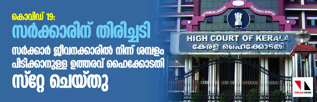 കൊവിഡ്-19 : സര്ക്കാരിന് തിരിച്ചടി; സര്ക്കാര് ജീവനക്കാരില് നിന്നും ശമ്പളം പിടിക്കാനുള്ള ഉത്തരവ് ഹൈക്കോടതി സ്റ്റേ ചെയ്തു