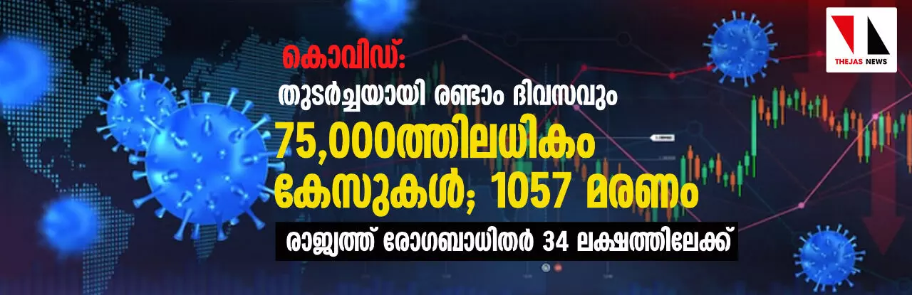 കൊവിഡ്: തുടര്ച്ചയായി രണ്ടാം ദിവസവും 75,000ത്തിലധികം കേസുകള്; 1057 മരണം; രാജ്യത്ത് രോഗബാധിതര് 34 ലക്ഷത്തിലേക്ക്