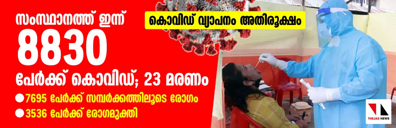 കൊവിഡ് വ്യാപനം അതിരൂക്ഷം: സംസ്ഥാനത്ത് ഇന്ന് 8830 പേര്ക്ക് രോഗം; 23 മരണം; 7695 പേര്ക്ക് സമ്പര്ക്കത്തിലൂടെ; 3536 പേര്ക്ക് രോഗമുക്തി