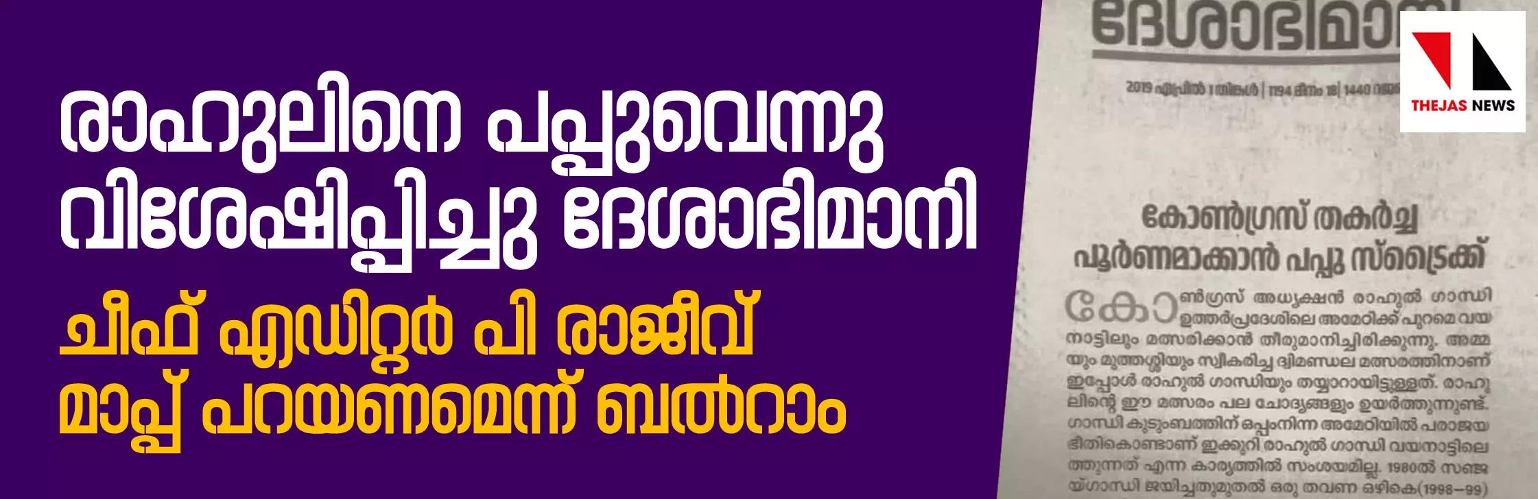 രാഹുലിനെ പപ്പുവെന്നു വിശേഷിപ്പിച്ചു ദേശാഭിമാനി; ചീഫ് എഡിറ്റര് പി രാജീവ് മാപ്പ് പറയണമെന്ന് ബല്റാം