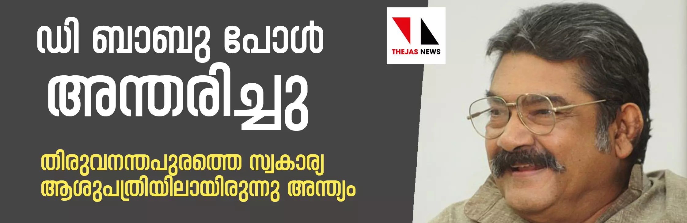തിരുവനന്തപുരം: മുന് അഡീഷനല് ചീഫ് സെക്രട്ടറിയും കിഫ്ബി ഭരണസമിതി അംഗവുമായ ഡോ. ഡി ബാബു പോള് ഐഎഎസ്(78) അന്തരിച്ചു. ശനിയാഴ്ച പുലര്ച്ചെ 1.15ഓടെ തിരുവനന്തപുരത്താണ് അന്ത്യം. ഹൃദയാഘാതത്തെ തുടര്ന്ന് വെള്ളിയാഴ്ച പുലര്ച്ചെയോടെയാണ് അദ്ദേഹത്തെ തിരുവനന്തപുരത്തെ സ്വകാര്യ ആശുപത്രിയില് പ്രവേശിപ്പിച്ചത്. നവകേരള നിര്മാണ പദ്ധതികളുടെ ഉപദേശകനായും അദ്ദേഹം പ്രവര്ത്തിച്ചു വരികയായിരുന്നു.യാക്കോബായ സഭയുടെ കോര് എപ്പിസ്കോപ്പയായിരുന്ന ഫാദര് പൗലോസ് ചീരോത്തോട്ടത്തിന്റെയും അധ്യാപികയായിരുന്ന മേരി പോളിന്റെയും മകനായി 1941 മെയ് 29ന് പെരുമ്പാവൂരിലാണ് ജനനം.പിതാവ് പ്രഥമാധ്യാപകായ കുറുപ്പംപടി എംജിഎം ഹൈസ്കൂളില്നിന്ന് എസ്എസ്എല്സിക്ക് സംസ്ഥാനത്ത് മൂന്നാംറാങ്ക് നേടിയിരുന്നു. ആലുവ യൂനിയന് ക്രിസ്ത്യന് കോളജിലും തിരുവനന്തപുരം കോളജ് ഓഫ് എന്ജിനിയറീങിലും തുടര്പഠനം. പ്രതിരോധശാസ്ത്രത്തിലും വേദശാസ്ത്രത്തിലും ബിരുദാനന്തര ബിരുദം നേടിയ ഇദ്ദേഹം 1962ല് സര്ക്കാരില് ജൂനിയര് എന്ജിനീയറായി. 1964 ല് എഴാം റാങ്കോടെയാണ് ഐഎഎസ് നേടിയത്. അഡീഷഷല് ചീഫ് സെക്രട്ടറിയായിരിക്കെ സ്വയംവിരമിച്ച് തദ്ദേശഭരണ ഓംബുഡ്സമാനാവുകയായിരുന്നു. 2001ല് എ കെ ആന്റണി മന്ത്രിസഭ ഓംബുഡ്സ്മാനെ പിരിച്ചുവിട്ടതോടെയാണ് ഔദ്യോഗിക സേവനത്തിനു വിരാമമായത്.
