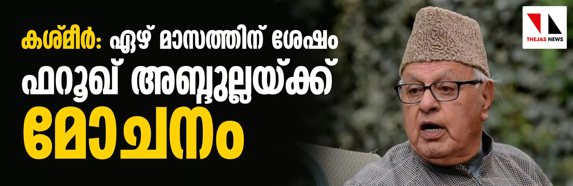 ഏഴ് മാസവും എട്ട് ദിവസങ്ങളും നീണ്ട നിന്ന കരുതല് തടങ്കലിന് ശേഷമാണ് മുന് മുഖ്യമന്ത്രിക്ക് മോചനം ലഭിക്കുന്നത്. ജമ്മു കശ്മീരിലെ പ്രമുഖ രാഷ്ട്രീയ ശക്തിയാണ് നാഷണല് കോണ്ഫറന്സിന്റെ തലമുതിര്ന്ന നേതാവാണ് ഫറൂഖ് അബ്ദുല്ല.
