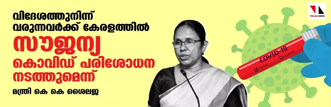 തിരുവനന്തപുരം: വിദേശത്തുനിന്ന് വരുന്ന എല്ലാവര്ക്കും കേരളത്തില് സൗജന്യ കൊവിഡ് പരിശോധന നടത്തുമെന്ന് മന്ത്രി കെ കെ ശൈലജ. കൊവിഡ് വ്യാപകമാവാന് സാധ്യതയുള്ളതിനാല് വിമാനത്താവളങ്ങളില് ശക്തമായ പരിശോധന നടത്തണമെന്ന് കേന്ദ്രസര്ക്കാര് സംസ്ഥാനങ്ങള്ക്ക് നിര്ദ്ദേശം നല്കിയിരുന്നു.