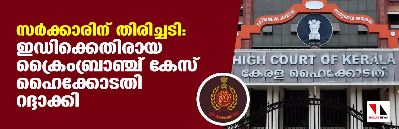 സര്ക്കാരിന് തിരിച്ചടി: ഇ ഡിക്കെതിരായ ക്രൈംബ്രാഞ്ച് കേസ് ഹൈക്കോടതി റദ്ദാക്കി