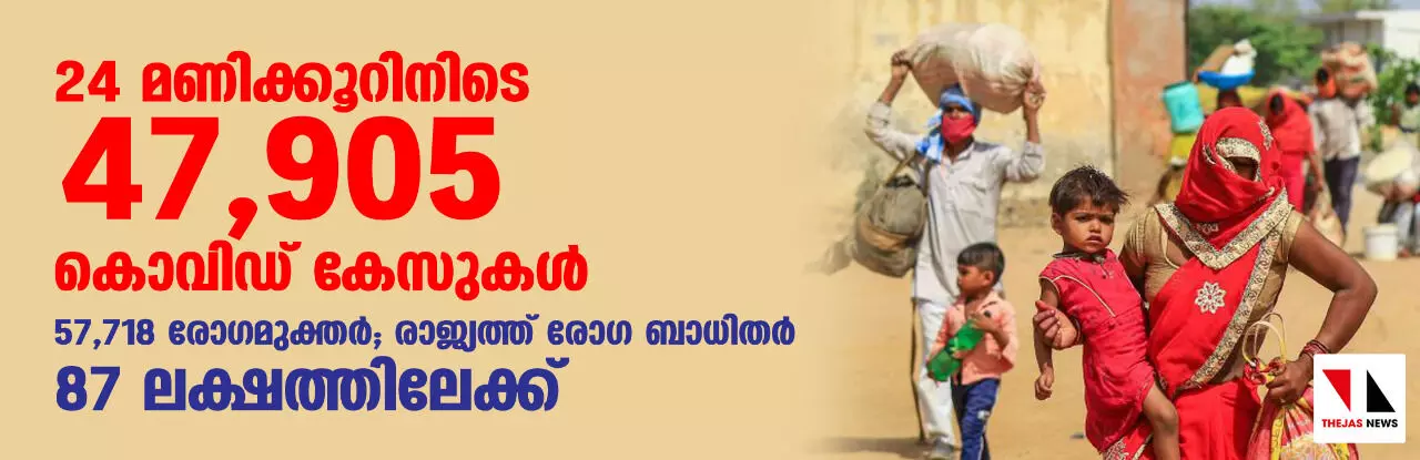24 മണിക്കൂറിനിടെ 47,905 കൊവിഡ് കേസുകള്; 57,718 രോഗമുക്തര്; രാജ്യത്ത് രോഗ ബാധിതര് 87 ലക്ഷത്തിലേക്ക്
