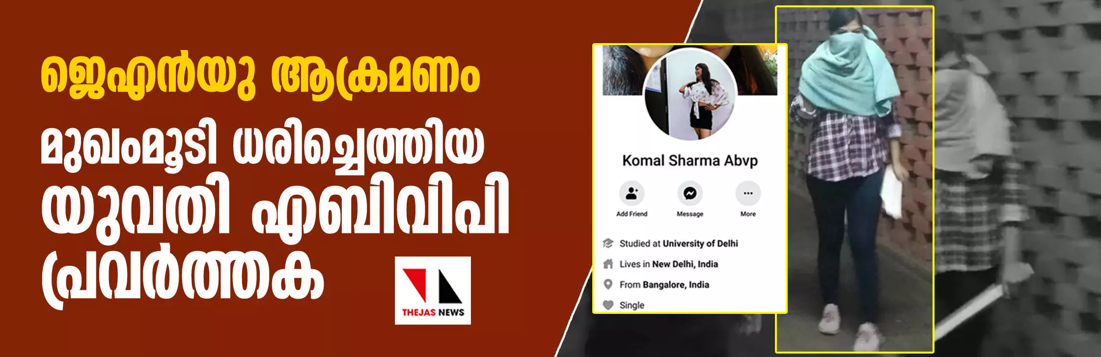 ജെഎന്യു ആക്രമണസമയം കോമള് ശര്മ മുഖം മറച്ച് കള്ളി ഷര്ട്ടാണ് ധരിച്ചിരുന്നത്. കൈയില് വടിയും മറ്റുമേന്തിയ മറ്റു ആക്രമണകാരികള്ക്കൊപ്പവും കോമള് നില്ക്കുന്നുണ്ടായിരുന്നു. തന്റെ ഫേസ്ബുക്കിലും താനൊരു എബിവിപി പ്രവര്ത്തകയാണെന്നു വ്യക്തമാക്കിയ കോമള് ശര്മ, പക്ഷേ സംഭവം പുറത്തായതോടെ അക്കൗണ്ട് ഡിലീറ്റ് ചെയ്തിരിക്കുകയാണ്. എന്നാല്, സാറ വഷിഷ്ഠ് എന്ന പേരില് കോമള് ഫേസ്ബുക്കും ട്വിറ്ററും ഉപയോഗിക്കുന്നതായും ഇന്ത്യാ ടുഡേ സംഘം കണ്ടെത്തിയിട്ടുണ്ട്. കോമളിന്റെ കോളജിലെ സഹപാഠിയെ ബന്ധപ്പെട്ടാണ് സംഘം ഇത് സ്ഥിരീകരിച്ചിട്ടുള്ളത്.