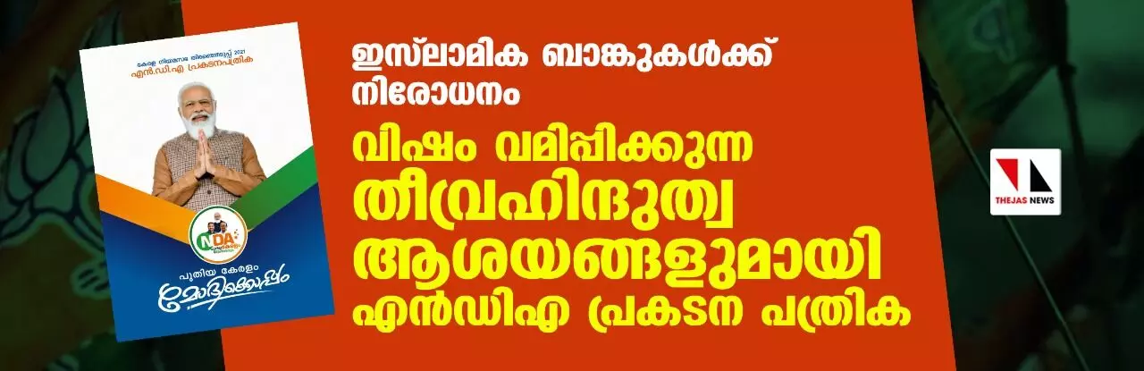 തിരുവനന്തപുരം: വിഷം വമിപ്പിക്കുന്ന തീവ്രഹിന്ദുത്വവര്ഗ്ഗീയ ആശയങ്ങളുമായി എന്ഡിഎ പ്രകടന പത്രിക. വര്ഗ്ഗീയ താല്പര്യങ്ങളില് ഊന്നിയ ഇസ്ലാമിക ബാങ്കുകള്ക്ക് നിരോധനം ഏര്പ്പെടുത്തുമെന്നും ലൗ ജിഹാദിനെതിരേ നിയമനിര്മാണം നടത്തുമെന്നും ഇന്ന് പുറത്തിറക്കിയ എന്ഡിഎ പ്രകടന പത്രികയില് പറയുന്നു. നിര്ബന്ധിത മതപരിവര്ത്തനത്തിന് നിരോധനം, മത സാംസ്കാരിക വിദ്യാഭ്യാസ മാധ്യമപ്രവര്ത്തനങ്ങളുടെ മറവില് നടക്കുന്ന തീവ്രവാദപ്രചാരണം തടയാന് സംവിധാനം ഏര്പ്പെടുത്തുമെന്നും പത്രികയില് പറയുന്നു. ഭീകരവിരുദ്ധ സ്ക്വാഡ് രൂപീകരിക്കും. കടല്ത്തീരം കള്ളക്കടത്തുകാരും ഭീകരവാദികളും ഉപയോഗപ്പെടുത്തുന്നത് തടയും. മത തീവ്രവാദ സംഘടനകളിലേക്കും ഭീകരപ്രവര്ത്തനങ്ങളിലേക്കും യുവാക്കള് കേരളത്തില് നിന്ന് റിക്രൂട്ട്് ചെയ്യപ്പെടുന്നത് തടയാന് ജനപങ്കാളിത്തത്തോടെ ശക്തമായ ബോധവല്ക്കരണവും പ്രതിരോധവും തീര്ക്കും.