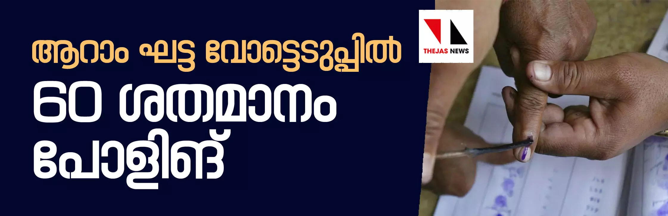 ന്യൂഡല്ഹി: യുപി, ഹരിയാന, ബിഹാര്, മധ്യപ്രദേശ്, ഡല്ഹി സംസ്ഥാനങ്ങളിലേക്കു നടന്ന ആറാം ഘട്ട വോട്ടെടുപ്പില് ശരാശരി 59.75 ശതമാനം പോളിങ്. തിരഞ്ഞെടുപ്പ് കമ്മീഷന്റെ ആറ് മണിവരെയുള്ള കണക്കുപ്രകാരമാണിത്. പശ്ചിമ ബംഗാളില് പല ബൂത്തുകളിലും അക്രമങ്ങള് ഉണ്ടായെങ്കിലും പോളിങ് ശതമാനത്തെ ബാധിച്ചില്ല.