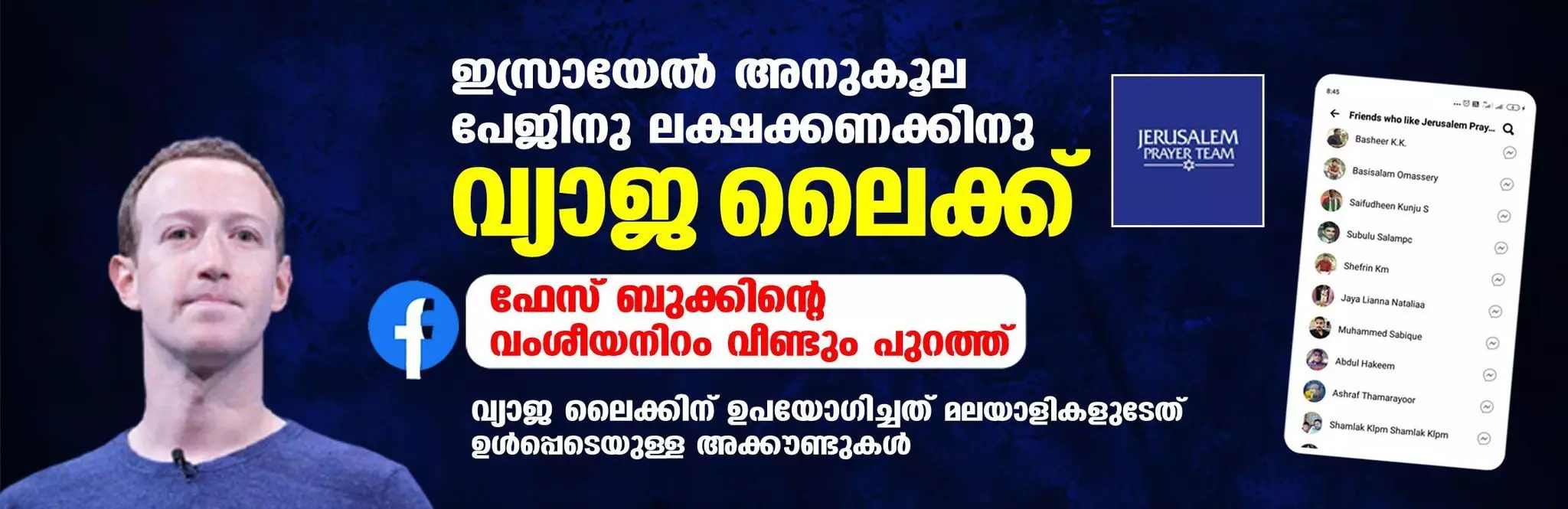 നേരത്തേ, ഫലസ്തീനിലെ ഒരു മാധ്യമപ്രവര്ത്തകന് ഫേസ് ബുക്കിന്റെ ഇത്തരം കുതന്ത്രങ്ങളെ കുറിച്ച് ആരോപണമുന്നയിച്ചിരുന്നു. 2018ല് നിര്മിച്ച് ജെറുസലേ പ്രെയര് ടീം എന്ന എഫ്ബി പേജിന് കഴിഞ്ഞ കുറച്ചു ദിവസങ്ങളിലായാണ് വ്യാപകമായ തോതില് ലൈക്ക് ലഭിച്ചത് എന്നതും ശ്രദ്ധേയമാണ്. യഹൂദ ജനതയെ സംരക്ഷിക്കാനും പ്രതിരോധിക്കാനും ജെറുസലേമിന്റെ സമാധാനത്തിനും വേണ്ടി പ്രാര്ത്ഥിക്കാനും സിയോണിന്റെ സുഹൃത്തുക്കളെ കെട്ടിപ്പടുക്കുക എന്നതാണ് ജെറുസലേം പ്രാര്ത്ഥന സംഘത്തിന്റെ ദൗത്യം എന്നാണ് എഫ്ബി പേജിലുള്ളത്. ഇതിലാണ് കേരളത്തിലെ മുസ് ലിം മത പണ്ഡിതരുടേത് ഉള്പ്പെടെയുള്ളവരുടെ അക്കൗണ്ടുകളില് നിന്ന് വ്യാജമായി ലൈക്ക് ചെയ്തിരിക്കുന്നത്. നിലവില് 76 മില്യണിലേറെ പേരാണ് പ്രസ്തുത പേജിനു ലൈക്ക് ചെയ്തിരിക്കുന്നത്. ജൂതവംശജനായ മാര്ക്ക് സുക്കര്ബര്ഗിന്റെ ഉടമസ്ഥതയിലുള്ള ഫേസ് ബുക്കഅ ആപ്ലിക്കേഷനെതിരേ നേരത്തെയും ഇത്തരത്തിലുള്ള ആരോപണങ്ങളുയര്ന്നിരുന്നു. ഇന്ത്യയില് ഹിന്ദുത്വര്ക്കും സംഘപരിവാരത്തിനുമെതിരേയുള്ള പോസ്റ്റുകളും വാര്ത്തകളും കമ്മന്റുകളും വ്യാപകമായി മറച്ചുവയ്ക്കുകയോ അത്തരം അക്കൗണ്ടുകള്ക്ക് താക്കീത് നല്കുകയോ ചെയ്യുന്നത് പതിവായിരുന്നു. തിരഞ്ഞെടുപ്പില് വരെ സാമൂഹിക മാധ്യമങ്ങളിലൂടെ അനുകൂലതരംഗമുണ്ടാക്കിയതായും ആരോപണങ്ങള് നിലനില്ക്കെയാണ് വീണ്ടും തങ്ങളുടെ വംശീയനിറം ഫേസ് ബുക്ക് വെളിപ്പെടുത്തിയിരിക്കുന്നത്. ഇതിനെതിരേ ഫേസ് ബുക്കിലൂടെ തന്നെ പലരും മുന്നറിയിപ്പും പ്രതിഷേധവും അറിയിക്കുന്നുണ്ട്.