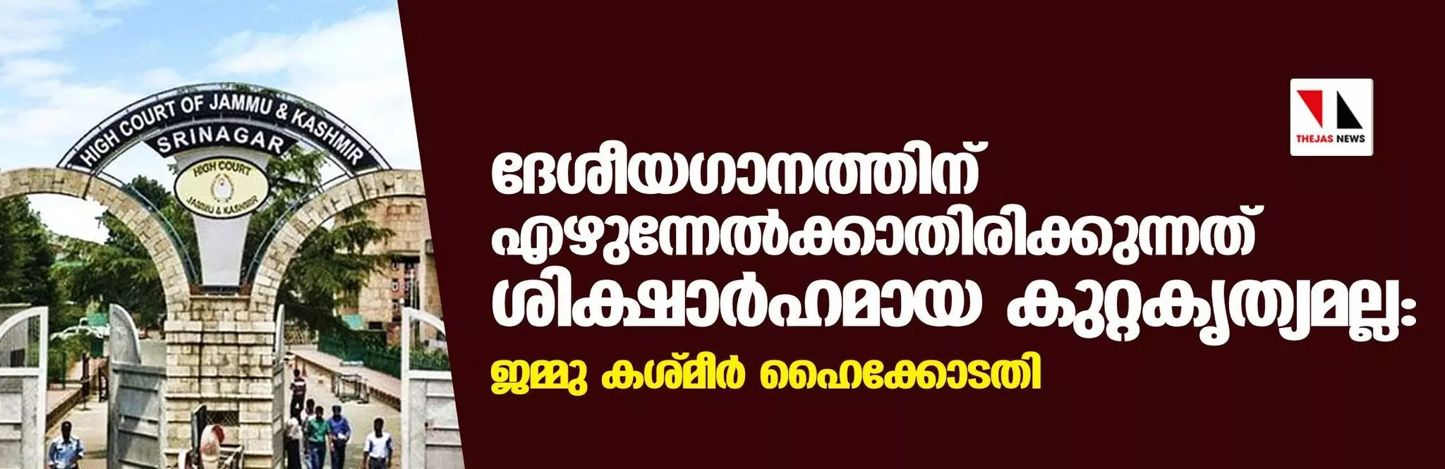 ദേശീയഗാനത്തിന് എഴുന്നേല്ക്കാതിരിക്കുന്നത് ശിക്ഷാര്ഹമായ കുറ്റകൃത്യമല്ല: ജമ്മു കശ്മീര് ഹൈക്കോടതി