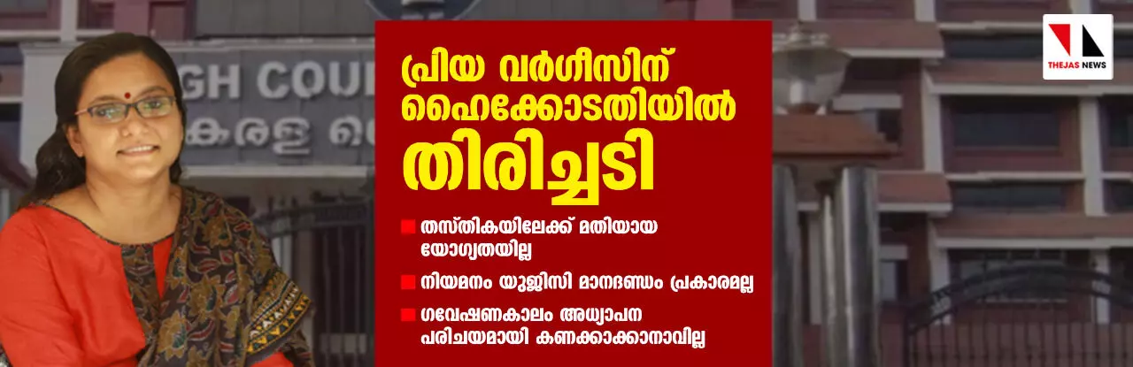 പ്രിയാ വര്ഗീസിന് ഹൈക്കോടതിയില് തിരിച്ചടി; അസോ. പ്രഫസര് തസ്തികയിലേക്ക് മതിയായ യോഗ്യതയില്ല