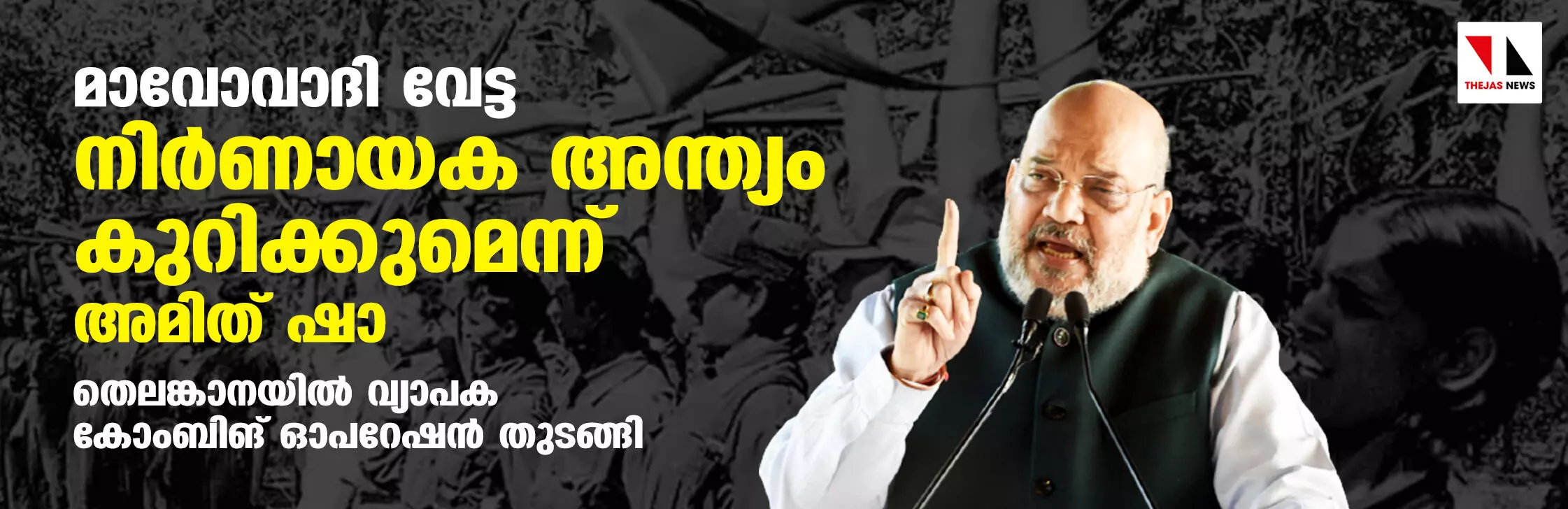 അതേസമയം അമിത് ഷായുടെ പ്രഖ്യാപനത്തിന് പിന്നാലെ തെലങ്കാന പോലിസ് വനമേഖലയിൽ വ്യാപക കോംബിങ് ഓപറേഷൻ ആരംഭിച്ചു. ഇതിന്റെ ഭാഗമായി തെലങ്കാന പോലിസ് സംസ്ഥാനത്തെ അതിർത്തി പ്രദേശങ്ങളിൽ സുരക്ഷ ശക്തമാക്കി. ഭദ്രദ്രി കോതഗുഡെം, മുളുഗു ജില്ലകളിലാണ് കോംബിങ് ശക്തമാക്കിയിരിക്കുന്നത്.