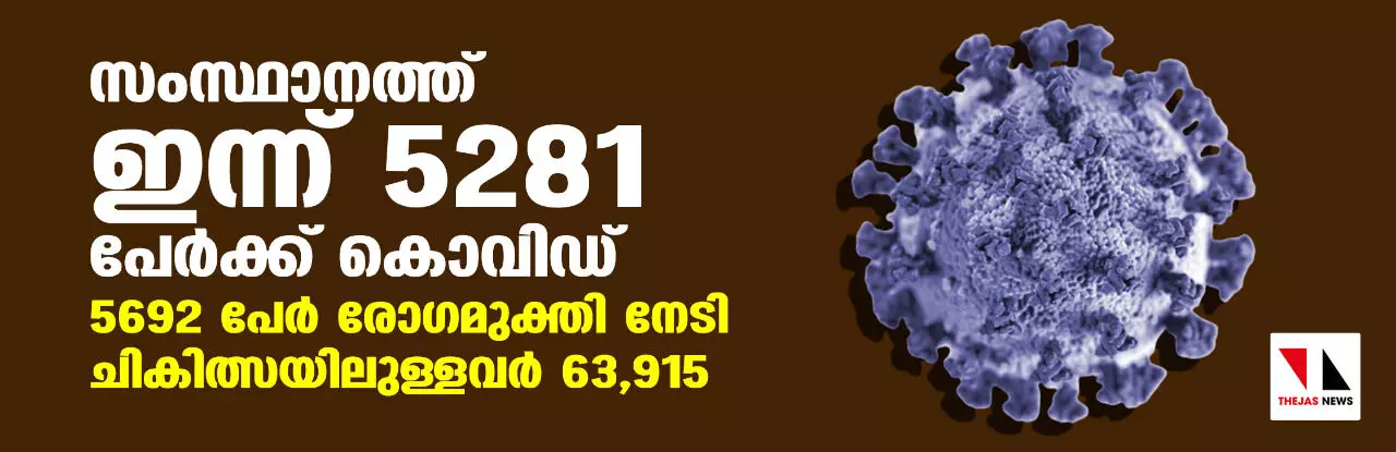 സംസ്ഥാനത്ത് ഇന്ന് 5281 പേര്ക്ക് കൊവിഡ്; 5692 പേര് രോഗമുക്തി നേടി; ചികിത്സയിലുള്ളവര് 63,915; ഇതുവരെ രോഗമുക്തി നേടിയവര് 9,20,539